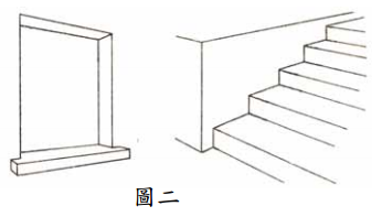【已刪除】三、請依圖二兩個獨立的物件(左為窗戶,右為台階)繪製其陰影,其光線投射設定 由左上往右下方向(請依照圖二尺寸按其比例適當放大)。(10 分)