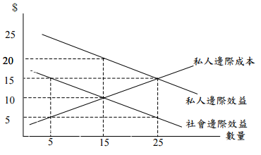 23 已知下圖為某產品的市場成本與效益曲線。若市場為完全競爭且政府並未介入,則下列敘述何者正確? (A)市場的均衡數量會比社會最適數量多 $ (B)市場的均衡價格會比社會最適數量對應的價格低 25 (C)該產品在生產上有負的外部性 (D)該產品在消費上有正的外部性
