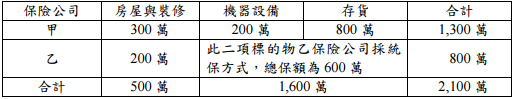 【已刪除】四、已知大華工業公司位於某新興工業區內,2008 年 1 月 1 日向甲保險公司投保商業火 災保險,為期 12 個月,又於同年 4 月 1 日向乙保險公司投保商業火災保險,為期 1 年。大華工業公司不幸於 2008 年 4 月 30 日發生火災,已知下列資料: (1)起火時之有效保險金額: