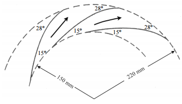 【已刪除】二、下圖顯示某離心式泵(Centrifugal pump)的升壓器葉片(Diffuser vane)尺寸與角 度,其中葉片垂直於圖面的通道寬度為 20 mm。在理想而無摩擦情形下,若該泵的 動葉輪輸送水的流率為 0.055 m