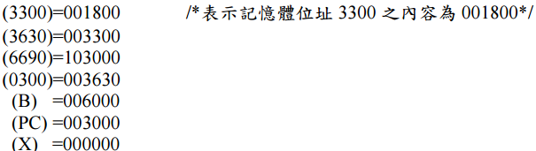 假設 LDA 指令係將指定的記憶體位址內資料載入累積器(Accumulator),請寫出執行 LDA 300(採用直接定址);LDA 300(300 為 memory address,採用 PC-relative 定址, 目標位址(Target Address)的值為 PC 的值加上位移值(Displacement));LDA @630, X (630 為 memory address,採用 PC-relative,X 表示索引,@表示間接定址); LDA #630 後暫存器 A 之內容。(20 分)