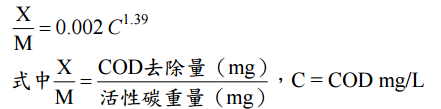 /day 水質為 50mg/L COD;規劃以活性碳吸附方式處理以 達 10 mg/L COD 放流水水質標準,其等溫吸附模式為: