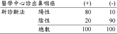 【已刪除】三、某科技公司發展了一種新診斷法可以早期偵測出鼻咽癌。經過在某大醫學中心 找了 100 位病人及 100 位正常人作檢測後得出以下結果(如表):(20 分)
