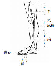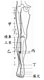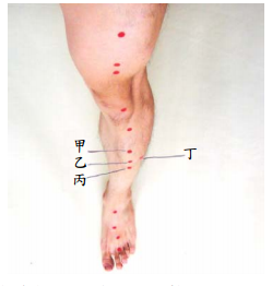 38 依《針灸科學》,足陽明胃經下圖何穴主治腿膝痠痛、喉痹、痰飲? (A)甲 (B)乙 (C)丙 (D)丁