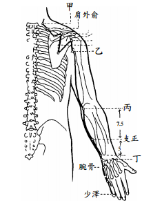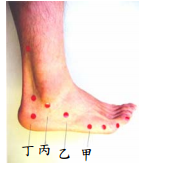 39 按八脈交會穴治療原則,下圖何穴主治腰背脊強,乳房紅腫? (A)甲 (B)乙 (C)丙 (D)丁