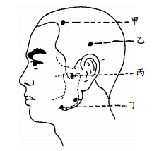 36 依《刺灸心法要訣》,下圖何穴主治頭風疼及目痛如脫淚不明等症? (A)甲 (B)乙 (C)丙 (D)丁