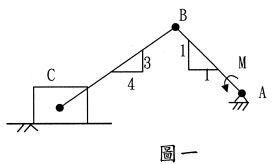 一、 如圖一,一質量20kg之重物C,放置於地面上,重物與地面之靜摩擦係數 = 0.25,動摩擦係數 = 0.2,AB桿長度為1.2m,問施力矩M多大時,重物C開始滑動。