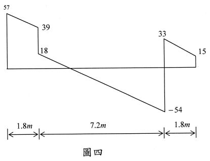 (一)一樑僅承受均佈力及集中力,其剪力圖如圖四,求樑之最大彎矩?(力單位:t)