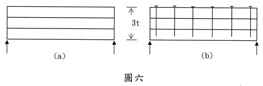 (三)三塊木板尺寸相同(均為寬度b厚度t)疊置成一簡支樑,如圖六(a),假設木板間相互無摩擦,其抗彎強度為M₁,如將三塊鋼板以鐵釘釘牢,如圖六(b),使相互間不會滑動,其抗彎強度為M2,則M2為M₁之幾倍?