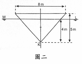 【已刪除】八、假設有一橫剖面如(圖二)的三角稜柱船舶,其船長為32 m,最上方之船寬為8 m,船深為5 m,船舶KG值為3.7m。當艏艉吃水皆為4m時,試求此船舶的 初始定傾高度GM為何?(10分)