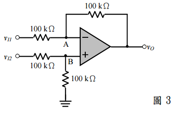 【已刪除】三、如圖 3 所示的差動放大器(difference amplifier),試求其放大器差動增益 Ad (amplifier differential gain),共模增益 Acm(common-mode gain)及共模拒絕 比 CMRR(common-mode rejection ratio)。 (20 分,其中 Ad 及 Acm 各 7 分 CMRR 6 分)
