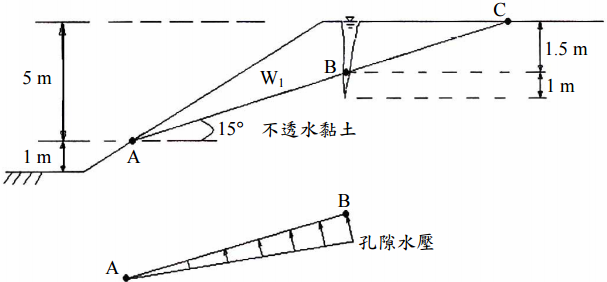【已刪除】一、如圖所示,在一雙層土壤內開挖 6 m 高的土坡,其下層土壤(ABC 界限下方)為不 透水的黏土,在坡頂已發生一道深 2.5 m 的張力裂縫,使上層土壤分為二塊,下邊 坡一側的土塊重量 W1為 1000 kN。張力裂縫內積水已高達坡頂的地面,且已入滲到 雙層土壤之界面(AB)內,假設界面 AB 內孔隙水壓線性分布型態如圖所示。並已 知雙層土壤界面剪力強度參數如下:(總應力狀況)c = 1.14 kPa、φ = 12°;(有效 應力狀況)c' = 0.9 kPa、φ ' = 17°,試計算土坡沿界面 AB 抵抗滑動的安全係數。 (25 分)