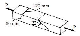 【已刪除】三、兩件木構件以斜面膠合方式接合如圖所示,其高度與寬度分別為 80 mm 及 120 mm, 接合面與水平方向夾 22°之角度。如該膠合位置所能承受之最大拉應力為 400 kPa, 則所能施加之荷載 P 之最大值為何?此時膠合面所受之剪應力為若干?(25 分)