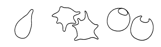 二、請敘述下列三種不同形狀的紅血球之成因及其臨床上之意義。(30 分)