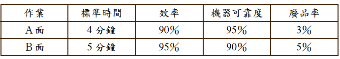 【已刪除】七、零件 X 需要在磨床上加工(先加工A面後再加工B面),倘若每週需求量為 3000 個,假使磨床在每生產 50 個零件之後,需要更換耗材並作預防保養,其所需時間 為 45 分鐘。試問至少各需要幾台機器?該公司每週作業 5 天,每天工作 16 個小時 ,且已知之資訊如下:(15 分)