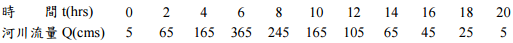 入滲指數為 5 mm/hr,其河川基流量為 5 cms 且為非時 變性。該集水區由延時為 2 小時的均勻降雨所形成之河川流量歷線如下所示: