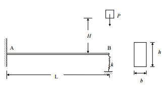【已刪除】二、如圖所示端點 B 由彈簧支撐之懸臂梁 AB,其斷面為 b × h 之長方形,梁的彈性模 數為 E,彈簧係數為 k。假設重量為 P 的重物從高度 H 自由下落,衝擊梁的 B 端。 試求此梁的最大正向動應力。(25 分)