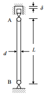 【已刪除】三、如圖所示之簡支撐的圓形細長鋼桿 AB,其長度 L = 1m,直徑 d = 16mm。在 20℃時 安裝,安裝後 A 端與剛性槽之間的空隙 δ = 0.25mm。假設安全係數 n = 2.5,鋼材 之彈性模數 E = 200GPa,降伏應力 σs = 200MPa,熱膨脹係數 α = 11.2×10