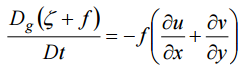 方程式中等號左項為追隨地轉運動之時間變化率,ζ為相對渦度(relative vorticity), f 為科氏參數(Coriolis parameter),u 與 v 為兩風速分量。試對此方程式進行對於 中高緯度綜觀尺度運動之尺度分析(scale analysis),估計各項目大小,並討論此方 程式之物理意義。為何綜觀尺度運動為接近無幅散(quasi-nondivergent)?(20 分)