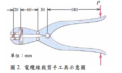 二、圖 2 所示為電纜線裁剪手工具,假設施力 P = 150 N,試計算電纜線裁剪作用力。 (25 分)