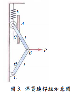 三、圖 3 所示一施力 P 作用於連桿組之 B 點;其中彈簧常數 k,且當