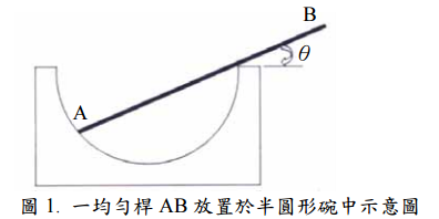 一、圖 1 所示一均勻桿 AB 長為 3R、重為 W,靜止於一半徑為 R 的半圓形碗中。假設 摩擦力可忽略,試求平衡時所對應的角度