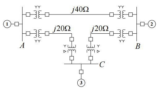 Y − Y變壓器(4 組):20 MVA、138 Y / 20 Y kV、X = 10%。