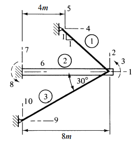 【已刪除】二、有一結構其構件及節點自由度編號如下圖,鋼纜①及③兩端均為鉸接,其斷面 性質為:A