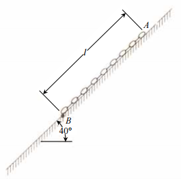 三、由如圖所示,已知一長度 l = 2m 、質量 M = 3kg / m 的鍊條由自由狀態釋放。設若鍊 條和斜面之間的摩擦係數 µ = 0.2 ,試求當端點 A 恰好通過另一端點 B 時,鍊條的 速度為多少?(20 分