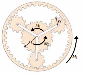 以逆時針方向作用在中間齒輪時,恰可使行星齒輪系統保持平衡狀態。假 設摩擦及重力作用皆可忽略不計,試求作用在三角架的力偶 M