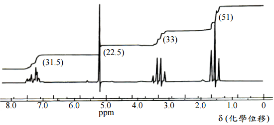 )及 碘化乙烷(iodoethane, CH3CH2I)混合物的1 H NMR(質子核磁共振光譜儀)圖譜, 試計算這三個化合物之重量百分組成。圖中積分線旁括號內的數值(無單位),與 相對應的訊號積分面積成正比。請詳述推理及計算過程。(25 分)Given: H =1, C = 12, O = 16, Cl = 35.5, Br = 80 and I = 127 g/mol.