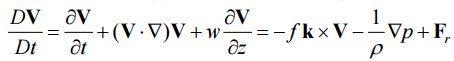 ( x, y, z , t ) 為水平風速向量, ρ 為密度,p為氣壓,