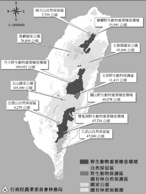 【已刪除】五、下圖為臺灣各種保護區(國家公園、自然保留區、野生動物保護區、野生動物重要 棲息環境)所構成的「中央山脈保育廊道」,請從生態學的觀點,說明這個廊道的 設立意義、對於保育之價值和可能的潛在問題。(20 分)