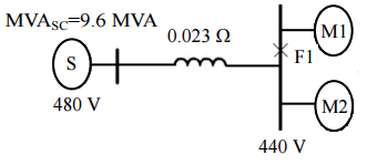 【已刪除】三、某電力系統如下圖所示,圖中兩台同步電動機連接在電壓為 440 V 之電動機匯流排 上,其次暫態電抗以 480 V、2000 kVA 為基底,分別為 及 。 此電動機匯流排經由一條阻抗為 0.023 Ω 之線路與系統電源相連接,系統電源的電 壓為 480 V,短路容量為 9.6 MVA,當於 F
