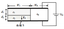 【已刪除】二、如右圖所示,某矩形平行板電容器之面積為 S,內填空氣及兩層介質材料,外接V0的電 壓。介質材料之介電係數(permittivity)分 別為ε1及ε2。試求此電容器之電容值及介質2(ε2)內之電場E