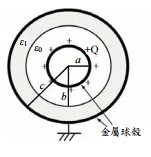 【已刪除】一、如右圖所示,兩同心金屬球殼內填同心空氣層及介質 層。介質層之介電係數(permittivity)為ε1。內金屬球 上帶有+Q之電荷,外金屬球則接地。試求在a < R < c 範圍內之電場分布及電位分布。(20 分)