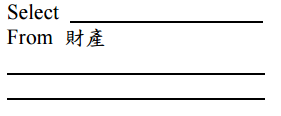 ⑵如果要查詢「財產編號」之第一碼為英文字母 A 到 J(為大寫字母)的任一字元; 第三碼為「-」;而第二碼與第四碼(含)以後則不限,而「財產編號」的資料型 別(Datatype)為 char(6)。此時 Select * From 財產 Where 請補足 Where 之後的指令。(10 分)