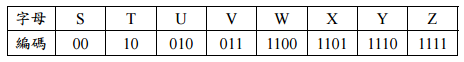 ⑴若以下列不定長度二進位編碼(variable-length binary code)來編碼此檔案,請問 每個字母平均用幾個位元表示?(5 分)