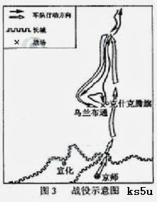14. 图3所示战役是 (A)明朝与瓦刺之战 (B)明朝与后金之战 (C)清军反击噶尔丹之战 (D)清军平定大小和卓之战