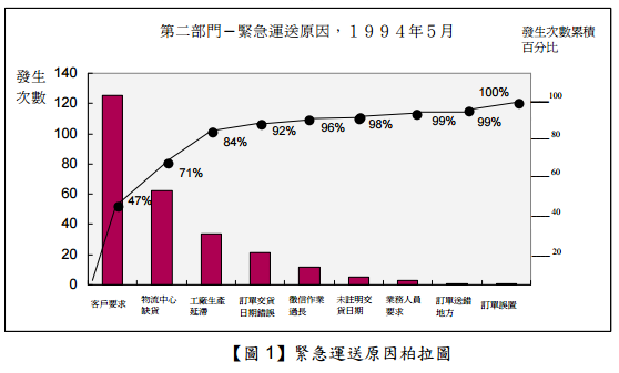 【已刪除】一: 假如你是一位運輸部門專員,請參考下列說明及【圖 1】的統計資料,幫公司提出三個 建議方案來降低第二部門的緊急運送成本。【25 分】 柏拉圖(Pareto Chart)乃將一項作業之柏拉圖效果繪製成一圖形。柏拉圖規則泛指產 生某一效果的大部分來自極少數的原因或因素,也稱之為 80/20 法則。【圖 1】列示柏拉圖 法則應用於物流配送活動緊急運送原因分析所繪製的柏拉圖。