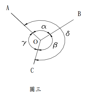 【已刪除】四、如圖三所示之測站 O,測得水平夾角α、β、γ、δ,其觀測值分別為α=94°20´35〞、 β=141°25´08〞、γ =124°14´26〞、δ=235°45´47〞。假設觀測量之間互相獨立 且精度相同,請用最小二乘法計算這些角度之平差值。(20 分)