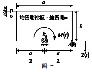 【已刪除】一、圖一為一均質剛性板(rigid plate),總質量m。M(t)為外加彎矩載重。 為旋轉彈 簧勁度, 為阻尼。在微小變位假設下,試以 A 點垂直向下位移Z(t)為位移座標列 出廣義質量(5 分)、廣義阻尼(5 分)、廣義勁度(5 分)、廣義載重(5 分), 及運動方程式(5 分)。