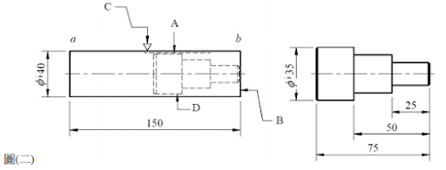 11. 一直徑 40 mm、長 150 mm 之低碳鋼圓棒,以車床車削加工成最大徑為 35 mm 之階級桿,參考圖(二),若將圓棒夾持於 a 端後,開始車削時,應最先車削之部位為下列何者? (A) 鋼棒之外表黑皮 (B) b 端之端面 B 處 (C) 距 b 端約 80 mm 處之淺溝識別記號 (D) 車外徑至約 35.5 mm 左右