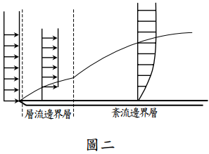 【已刪除】二、如圖二所示,流體流經平板之流況,會形成層流邊界層(laminar boundary layer)及 紊流邊界層(turbulent boundary layer)。請說明會發生邊界層的原因及平板糙率的 可能影響。(25 分)