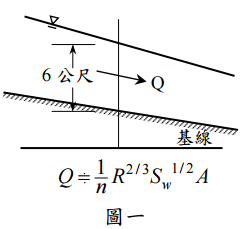 【已刪除】一、如圖一所示,某一河段寬 2000 公尺,曼寧糙率係數為 0.03。某一次洪水過程中, 由洪水痕跡推估水面坡度為 1/2000,水深 6 公尺,請推估洪峰流量,並討論可能介 入的誤差。(25 分)