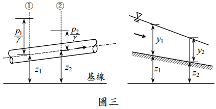 【已刪除】三、如圖三所示之管流及渠流,請說明二者之能量頭方程式的表示方法有何不同?(20 分)