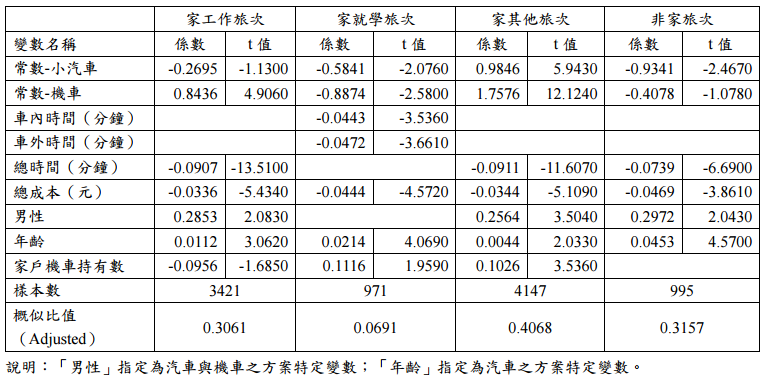 【已刪除】四、以下為台灣某都市運具選擇多項羅吉特模式校估結果(包含三種運具:小汽車、機 車與大眾運輸)。請評估這些模式是否合理、良好?請從各變數係數之符號、大小、 相對比值、模式配適度等觀點來說明。(20 分)