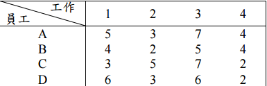 【已刪除】三、某部門主管要將四項工作指派給四個員工(以 A, B, C, D 表示)去完成,工作的完 工成本與員工對該項工作的經驗有關,每位員工完成各項工作的成本(單位:10 元) 如下表所列: