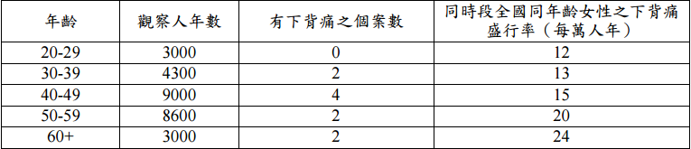 請利用間接標準化方法計算該護理人員族群年齡標準化盛行比(Age Standardized Prevalence Ratio, SPR),並據此說明該護理族群罹患有下背痛之盛行率是否較一般 女性族群高?(20 分)