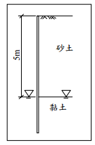 【已刪除】一、如圖所示有一版樁(sheet pile)使用於深 5 m 之開挖支撐,地下水抽取至開挖面位 置,其背後為砂性土壤,單位重 γm =17.4 kN/m